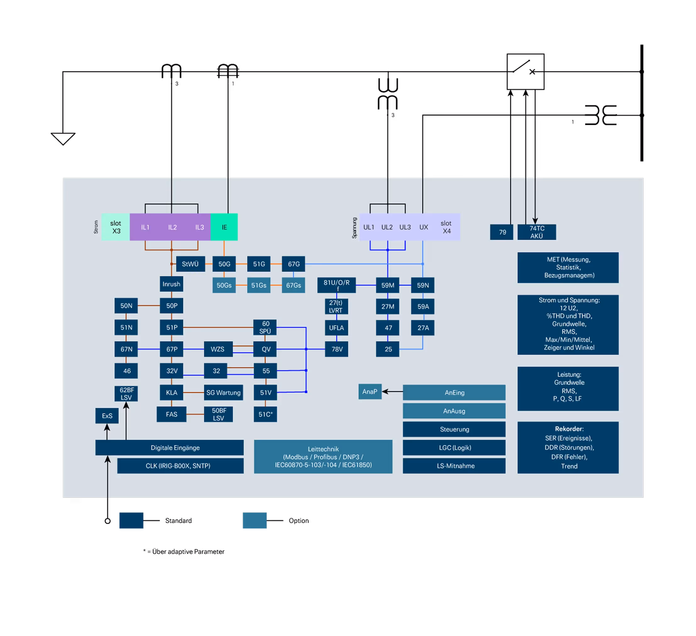 The implemented switchgear management guaranties an efficient and safe control and supervision. The device is a bench mark in flexibility and usability and offers various communication options. The hardware is designed for all nominal values in combination with protection and control functionality.