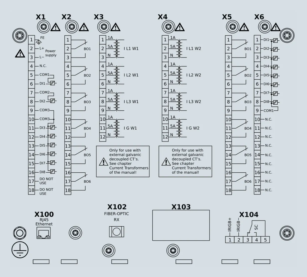 - Buchholz (sudden pressure), ext. oil temperature, and aux. temperature protection via digital input